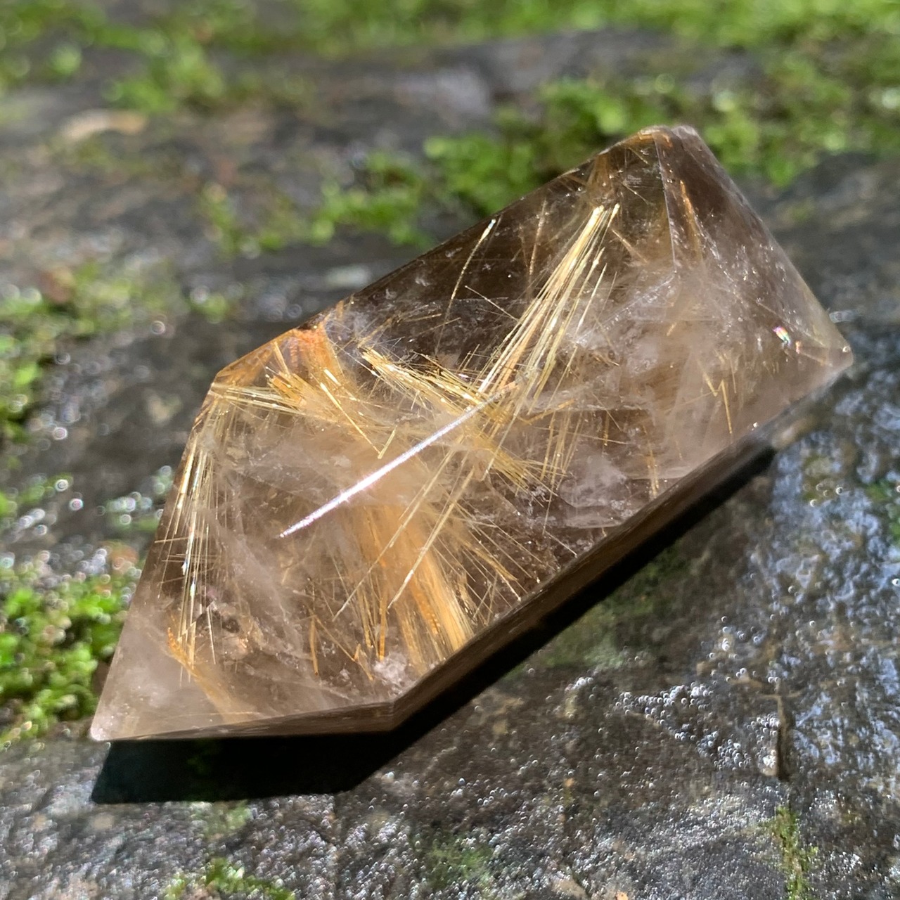 グラウンディングストーンのスモーキークォーツのなかに 針状の黄金のルチルが 縦横無尽に 勢いよく飛びまわっている こちらのスペシャルクリスタルが与えてくれるインスピレーションは、金の鉱脈、循環、加速、情熱、経済、倍増、大胆さ、拡大、豊かさです。真の魂の望みと結びついた選択をし、これから おもいきった 大きな変化を 遂げられるかたへ