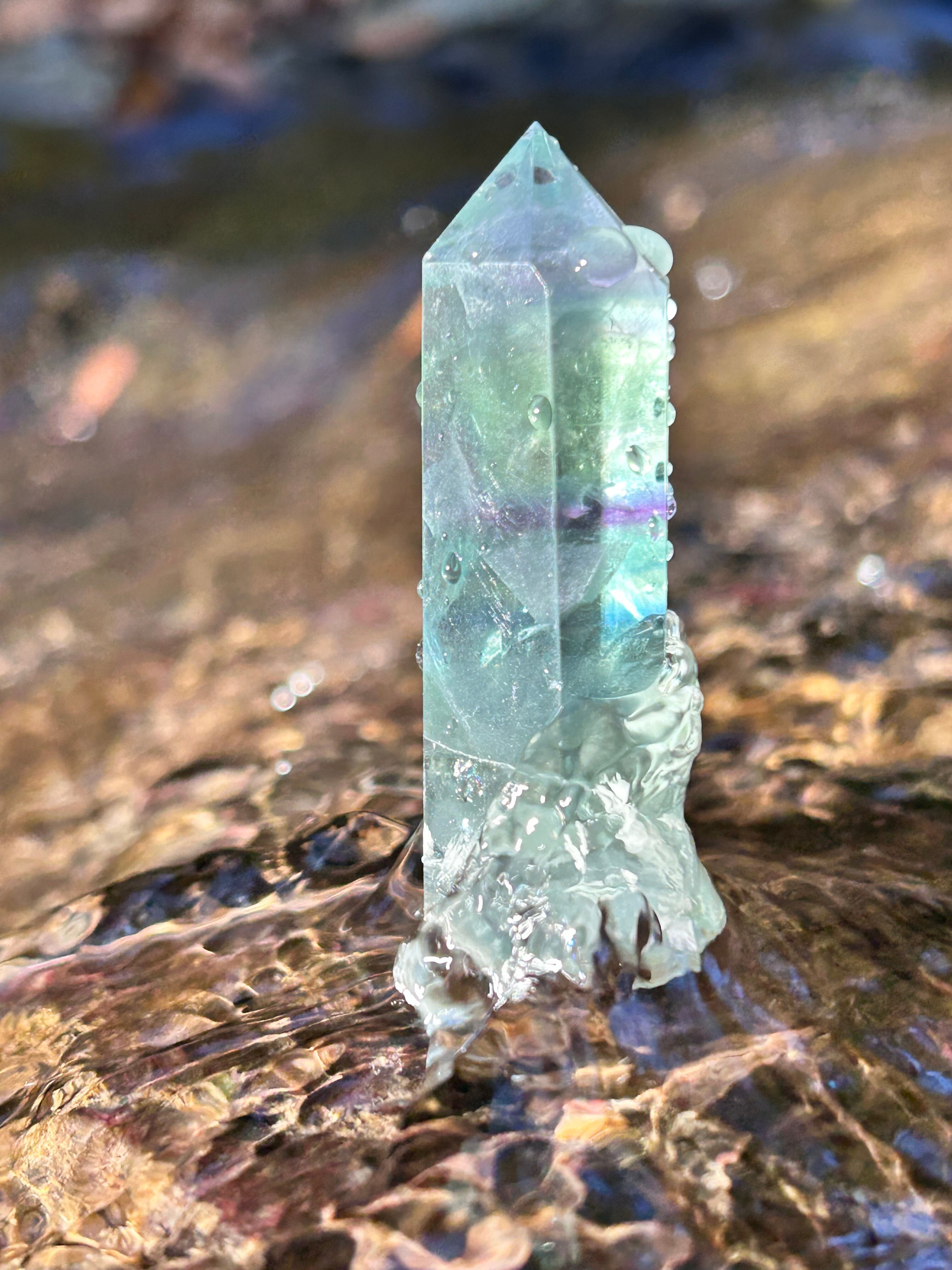 Centre of Distant Theatre の拠点・秋谷の龍神の昇りゆく聖山の湧き水の愛の祝福を存分に受けました蛍石です。龍神のエナジーを湛えながら美しく直立する、聖なるフローライトタワーです。